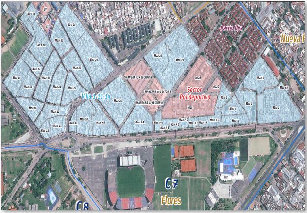 La Figura 1 ilustra la extensión territorial del barrio y su organización en manzanas azules para la parte que se conoce como villa o asentamiento, y manzanas rojas para la zona urbanizada. El comedor donde trabaja el FOL (y donde hemos realizado las entrevistas), se ubica en el lateral derecho de la manzana 9A, frente al estadio Pedro Bidegain del Club Atlético San Lorenzo de Almagro, que se encuentro cruzando la Av. Perito Moreno. Los otros tres establecimientos del FOL se encuentran en las manzanas 1, 2 y 15, expresando una inserción extensa en puntos neurálgicos del barrio.