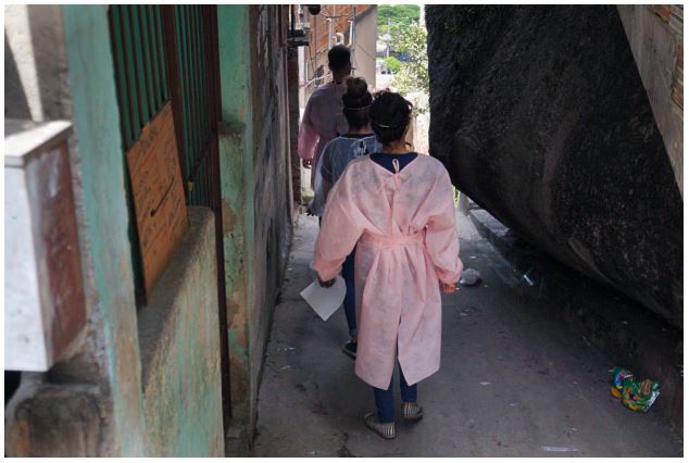 Este ensaio foi dividido em três segmentos: Provimento emergencial de alimentos; Pandemia e território; Acolhimento e escuta qualificada. O primeiro segmento evidencia a organização institucional e os protocolos de segurança adotados para entrega presencial das cestas básicas aos familiares, percebe-se através das imagens a uniformização e despersonifização da equipe psicossocial pela necessidade de uso dos equipamentos de proteção individual, além dos olhares de preocupação dos familiares frente ao futuro, e das incertezas em relação às estratégias de enfrentamento e ao tempo de duração da pandemia. As imagens do segundo segmento revelam ruas vazias, as dificuldades de acesso da equipe psicossocial ao território/residência dos usuários com deficiência, e o isolamento social como estratégica de contenção de casos, muitas vezes interpretado e vivenciado pelos familiares como um enclausuramento. O último segmento demonstra através das fotografias a escuta qualificada e o acolhimento psicossocial, a construção permanente de vínculos, a produção de relações de respeito à diversidade e à singularidade de cada caso e realidade familiar.