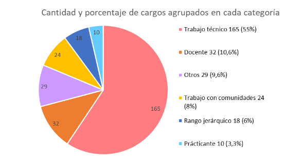 Para analizar esta información agrupamos los cargos en seis categorías analíticas, creadas por nosotros a partir del principal descriptor que caracteriza cada cargo. Estas categorías surgieron luego de ver la totalidad de los cargos recopilados y reconocer que era posible agruparlos. Lo anterior no significa que cada cargo no comparta características y funciones alusivas a las otras clasificaciones, sino que asignamos la categoría teniendo en cuenta el descriptor principal del cargo. Así, por ejemplo, un “analista de campo” aunque trabaja cercanamente con comunidades, la descripción de su cargo se centra en la labor técnica. Como se puede observar en el gráfico, de los 278 trabajos que los 112 egresados encuestados indicaron en la encuesta haber tenido desde su graduación del pregrado hasta finales de 2020, 165 los agrupamos en la categoría de Trabajo técnico, 32 en Docente, 29 en Otros, 24 en trabajo con comunidades, 18 en rango jerárquico y 10 en practicante.