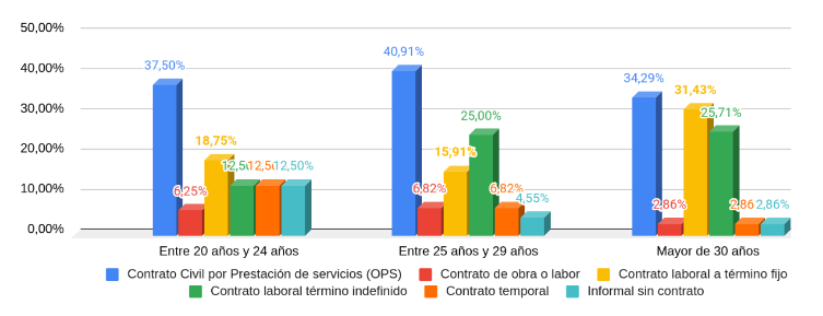 Llama la atención que, a pesar de los diversos tipos de contratación en Colombia de prestación de servicios, por obra o labor, a término fijo, término indefinido, de aprendizaje y contrato temporal ocasional (mintrbajo.gov.co, s.f.) (Infobae.com, 2020), la mayoría de los contratos ofrecidos a los antropólogos egresados de la PUJ son contratos por prestación de servicios. En el gráfico, se pueden observar por edades los porcentajes de profesionales que han tenido alguno de los contratos mencionados. Es interesante observar cómo a pesar de que predomina un tipo de contrato entre los egresado encuestados, el tipo de contratación varía según su edad.