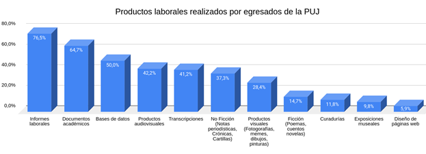 Como se puede observar en este gráfico, contrario al imaginario que se suele tener sobre el trabajo de los antropólogos y “hacer campo”, la información recopilada en la investigación muestra que a los antropólogos de la PUJ los contratan también para recoger, sistematizar y analizar la información de diversas formas. Entre estas destacamos la realización de informes laborales; el análisis de bases de datos; los productos audiovisuales; las transcripciones de documentos y entrevistas, revisiones de archivo, el diseño de talleres, actividades lúdicas, e instrumentos pedagógicos, estrategias de prevención del riesgo, entre otras actividades que, como se puede observar, no necesariamente implican un contacto e interacción con una determinada población.