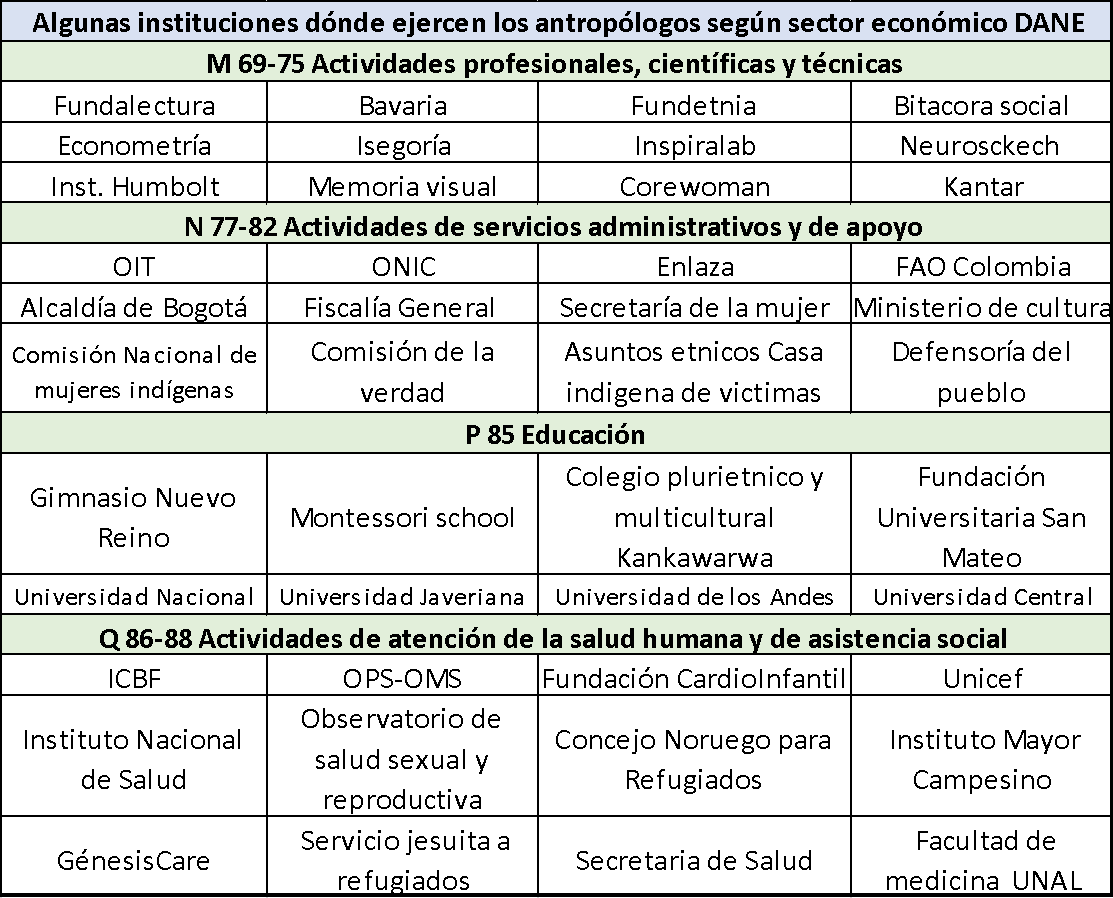 En la siguiente tabla se pueden observar los nombres de algunas de las instituciones en las que los antropólogos han ejercido su profesión. Consideramos que esta tabla es un insumo más para comprender el abordaje y apropiación de la antropología por parte del sector público y privado. Igualmente, puede ser una herramienta para que los profesionales interesados tengan en cuenta estos lugares en sus procesos de búsqueda de empleo.
