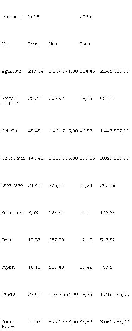 Del total de hortalizas consideradas, entre 2019 y 2020 hay un aumento de 4,9 mil hectáreas: sólo se reduce superficie y producción de fresa, pepino y tomate rojo en proporciones poco significativas, que se diluye si se toma en cuenta el rendimiento medio por hectárea, 52 toneladas por hectárea de fresa y 74 toneladas para el pepino y el tomate rojo. Los cambios en superficie y producción de hortalizas obedecen a factores de mercado y no sanitarios como la COVID-19.
