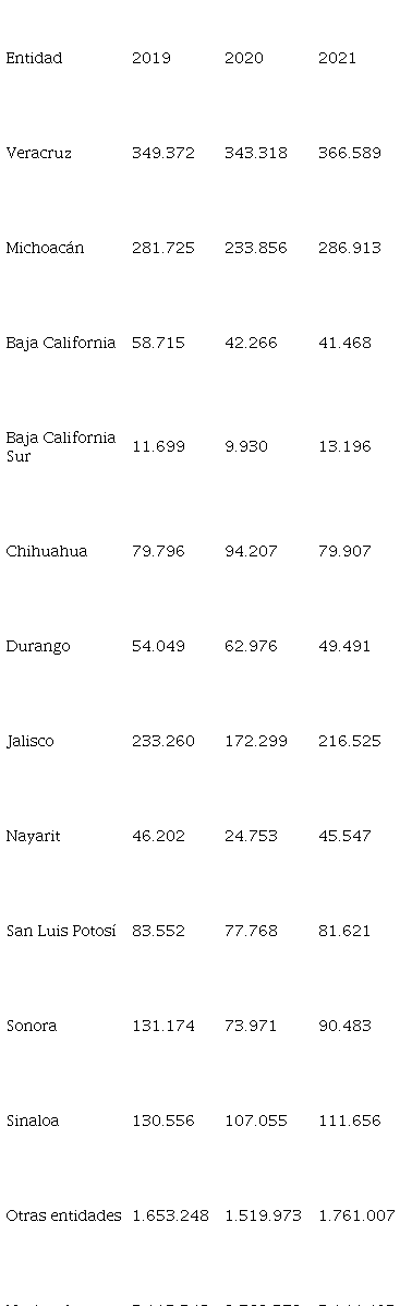 La reducción de la producción y los desajustes del mercado internacional no permiten afirmar que los desajustes en el empleo de jornaleros se hayan debido exclusivamente a los efectos de la COVID-19, pero es posible que la falta de movilidad de los jornaleros migrantes haya llevado a la reducción en la contratación en las entidades de atracción3 de jornaleros. Sin embargo, pese a la falta de argumentos sustentados, este fenómeno de contracción del empleo, sin una reducción significativa de la superficie cosechada y sin un aumento de las exportaciones, lleva a suponer que los ajustes en la producción se dieron aumentando las condiciones de explotación de los jornaleros y precarizando sus condiciones de trabajo.