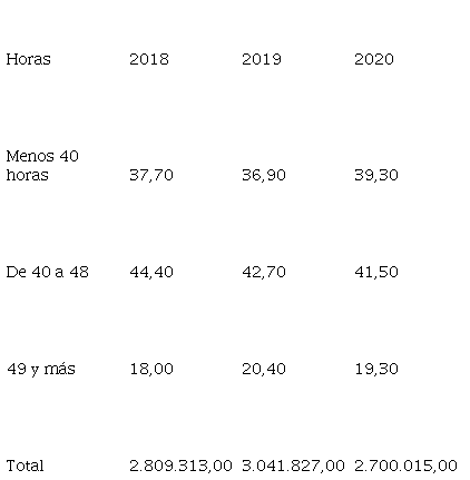 A nivel nacional, aunque la moda en este período se mantiene entre 40 y 48 horas semanales, esta proporción fue a la baja, para compensarse con un aumento de los que trabajan menos de 40 horas y más de 48.