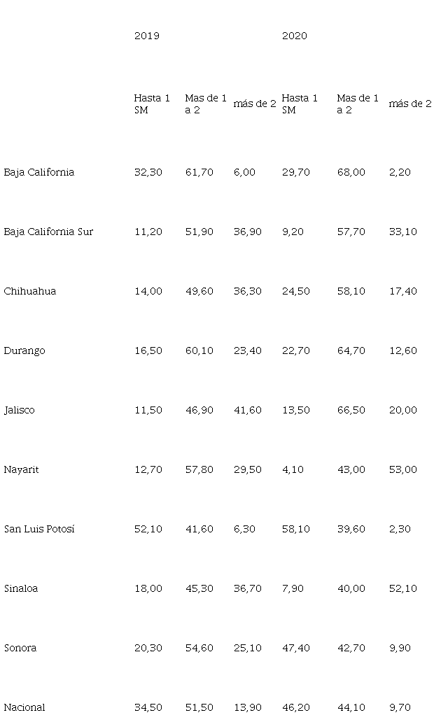 Si bien aumentan quienes reciben más de 1 y hasta 2 salarios mínimos, en casi todas las entidades receptoras se redujo la proporción de los que reciben más de 2 salarios mínimos, excepto Nayarit y Sinaloa. Esto supone que en el resto de las entidades consideradas el trabajo a destajo se redujo, mecanismo que si bien esconde una sobreexplotación de la fuerza de trabajo, por la estacionalidad de la actividad, en un período muy breve, de 1 a 2 meses, que es el período de cosecha, el jornalero tiene la posibilidad de ganar 2 o 3 mil pesos semanales; después de ese período el trabajo y el ingreso son inciertos.