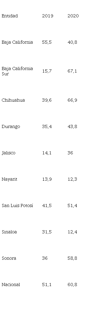 Si se compara la población jornalera que recibió hasta un salario mínimo entre 2019 y 2020, encontramos un incremento de pobreza alimentaria en la mayoría de las entidades consideradas, excepto Baja California, Baja California Sur, Nayarit y Sinaloa.
