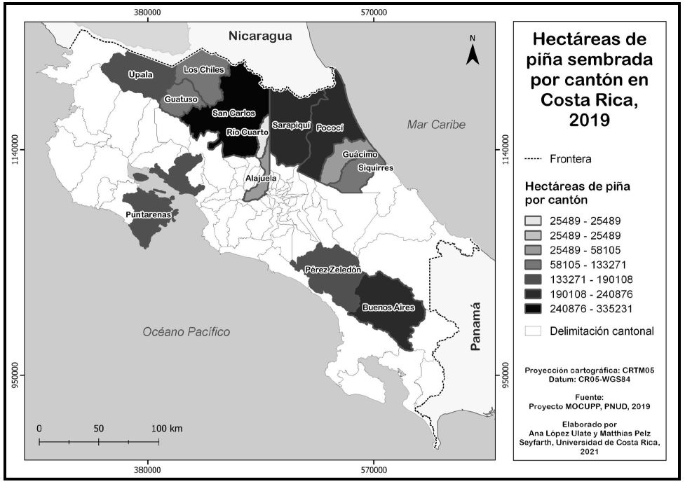 La expansión de este cultivo se ha realizado sin un verdadero control estatal, y actualmente Costa Rica es el principal exportador mundial de piña fresca. Según el Programa de Monitoreo de Cambio de Uso de Paisajes Productivos (MOCUPP) del Programa de las Naciones Unidas para el Desarrollo (PNUD), Costa Rica dedicó 65.442,41 hectáreas a la piña en el año 2019, de las cuales 44.138,94 están localizadas en la Zona Norte4 de Costa Rica (ver figura 1), es decir un 68% del área del cultivo nacional está en posición de frontera. Este cultivo hace uso de grandes cantidades de agroquímicos y pesticidas que han venido contaminando la cuenca y el acuífero transfronterizo del río San Juan (Rodríguez Echavarría, Obando y Acuña, 2018; Rodríguez-Echavarría y Prunier, 2020). A nivel nacional, la piña se ha convertido en el segundo producto agrícola más exportado de Costa Rica solo después del banano.