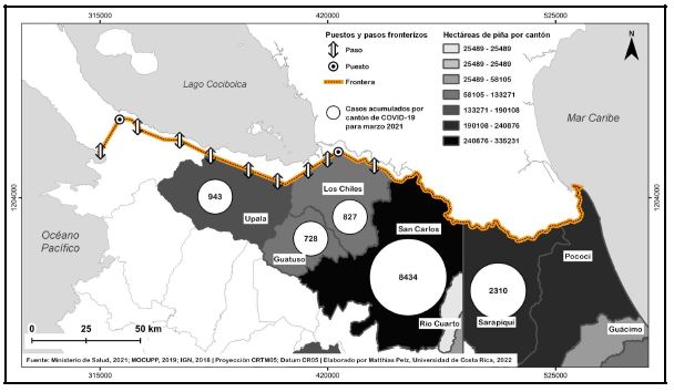 La región fronteriza compartida por Costa Rica y Nicaragua está marcada por los antiguos conflictos fronterizos entre ambos países, vinculados al río San Juan. Es una de las regiones más aisladas y pobres de los dos países. En los últimos 30 años el lado costarricense de la frontera ha experimentado la expansión sin control del cultivo de la piña a lo largo de toda la franja fronteriza (León Araya, 2015; León Araya & Montoya Tabash, 2021). Este cultivo ha conectado esta región fronteriza con el mercado mundial a través de la presencia de importantes empresas nacionales y transnacionales.