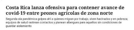 A partir de ese momento, durante las declaraciones oficiales en cuanto a la situación de la COVID-19 realizadas por el gobierno costarricense, se empezó a debatir sobre el tema de la agroindustria y la contratación de personas migrantes en condición irregular en la zona norte del país en los medios de comunicación con mayor audiencia. Hasta entonces este tema había permanecido invisibilizado en los debates nacionales. Se cuestionaban las condiciones de trabajo en la que las personas migrantes se desempeñan, específicamente en las piñeras, al mismo tiempo que el ministro de Salud anunciaba sanciones para las empresas que incumplieran las restricciones sanitarias. Por ejemplo, se estableció que las empresas que contrataran a trabajadores en condición migratoria irregular serían clausuradas y deberían rendir cuentas ante el Poder Judicial (Quesada, 2020b). Para esto, el gobierno costarricense desplegó un operativo interinstitucional sorpresa en empresas agrícolas fronterizas con el fin de investigar los incumplimientos denunciados (contratación irregular e incumplimiento de derechos y garantías laborales) (Quesada, 2020c, 2020d).