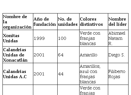 Sin embargo, este primer grupo pionero del servicio rechazó una gran cantidad de personas que querían sumarse a la labor. La consecuencia fue que otra gente creara sus propias organizaciones, haciendo que surgieran más unidades de bicitaxi en la cabecera municipal. Cronológicamente surgieron de la siguiente manera: “Xonitas Unidas”, fundada en 1999; “Calandrias Unidas de Xonacatlán”, en 2001; “Calandrias Unidas A .C” en 2003. Luego, los “Xonitas Unidas” se fragmenta por problemas internos entre los principales líderes, lo cual provocaría que surgieran “Calandrias Halcones” y “XonComet”, en el 2006; y para el 2010 aparece la última organización, con el nombre “Vicente Guerrero”.