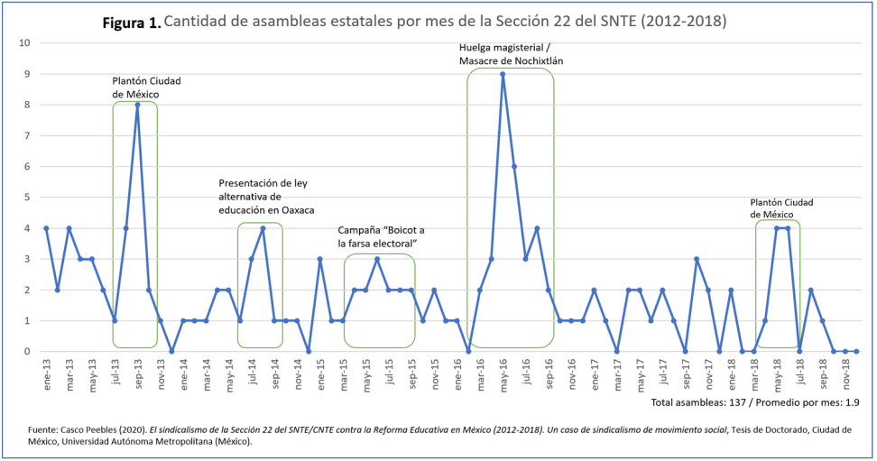 Este tipo de acciones y subjetividades sindicales descritas estaban articuladas a la forma de organización de la seccional. La manera en que se organizaba la S-22 articulaba espacios estatutarios del SNTE con espacios no estatutarios creados por el movimiento a lo largo de las décadas. Por ejemplo, mantuvo al Comité Ejecutivo Seccional (CES) (146 integrantes) y a los Comités Ejecutivos Delegacionales (CED) (cerca de 850 distribuidos por todo Oaxaca), pero le sumó una serie de espacios no oficiales que la robustecieron y le asignaron un sentido distinto a la organización. Particularmente relevante fue la incorporación de asambleas para tomar decisiones colectivas, ya sea en el nivel escolar, delegacional, de nivel educativo, de región o estatal. Así, la asamblea estatal se convirtió en el principal espacio de toma de decisiones de la seccional en la cotidianeidad de la vida sindical, en donde -mediante acaloradas discusiones- cientos de representantes del conjunto de los CED llegaban a acuerdos y tomaban decisiones que luego el CES debía ejecutar. Por ejemplo, durante el mandato de Peña Nieto realizaron 137 asambleas estatales, las que, en momentos de conflicto, se realizaban de manera seguida (a veces una por día) y en los momentos de tranquilidad sindical se espaciaban más, como se puede ver en la figura 1.