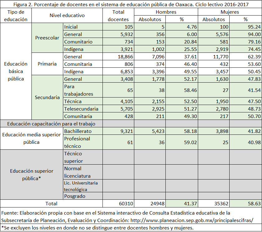 Fuente: Elaboración propia con base en el Sistema interactivo de Consulta Estadística Educativa de la Subsecretará de Planeación, Evaluación y Coordinación http://www.planeacion.sep.gob.mx/principalescifras/Por otro lado, aunque no poseemos datos numéricos, a partir de nuestro involucramiento en las actividades sindicales de la S-22, se puede advertir una clara presencia de las maestras y maestros. Es decir, la militancia de la S-22 era de ambos. No se puede afirmar que la vida sindical fuera una cuestión solo de hombres; al contrario, era una en donde la presencia femenina era constante. Este activismo de las maestras tampoco fue algo de los últimos años, sino que ya estaba presente al inicio del movimiento magisterial independiente en la década de 1980 (Núñez, 1990).