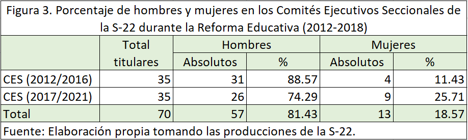 Entonces la base laboral era en su mayoría femenina, y ellas eran activistas sindicales protagónicas dentro de la seccional, pero ¿qué porcentaje de mujeres llegó a la dirección de la seccional? Para responder a esto contabilizamos a los titulares y responsables de las secretarías y carteras de los dos Comités Ejecutivos Seccionales (CED) que existieron durante la lucha contra la Reforma Educativa. Los resultados fueron los que se visualizan en la figura 3.
