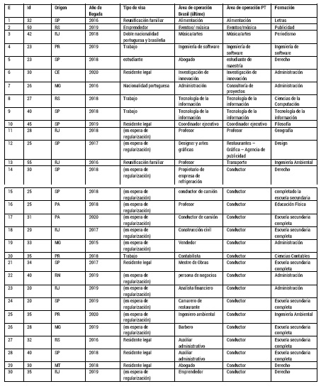 Con el objetivo de a) presentar la cuarta ola de inmigrantes varones brasileños en Portugal - que comprende el período de 2015 a 2020 y b) mapear y describir las diferencias entre dos grupos de inmigrantes brasileños varones en este país, esta investigación, predominantemente cualitativa, se basa en 30 entrevistas con brasileños. La tabla 1 presenta, de forma resumida, el perfil de los entrevistados.