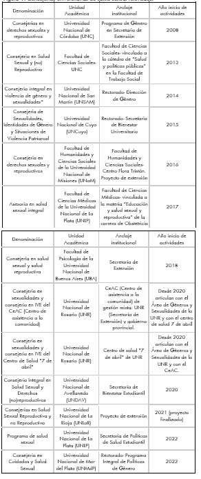 Abstract: This article analyzes the emergence and multiplication of sexual health counseling spaces in the national universities of Argentina. It focuses on the years 2008-2022, between the first and the last counseling space registered. Methodologically, a documentary analysis was carried out based on the survey of the information available on the official web pages of the national universities of the seven Consejos Regionales de Planificación de la Educación Superior (CPRES) that make up the higher education system in the country. Fifteen in-depth interviews were also carried out with a total of 22 referents from 14 university sexual health counseling spaces between April and September 2022. As main contributions, the article proposes a) a periodization of the process of creation of university sexual health counseling spaces that distinguishes between a moment of emergence and another of multiplication, b) an interpretation of the predominance of the term "counseling" and, simultaneously, the diversity of ways of referring to sexual health and c) an analysis of the exchanges established, regarding sexual health counseling spaces, between university management and feminist militancy through the notion of trabajo militante.