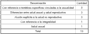 Ahora bien, ¿cuáles son las temáticas abordadas por estos dispositivos? La denominación formal elegida por las distintas universidades constituye un adelanto de aquello sobre lo que cada una se propone trabajar y la perspectiva teórico-política adoptada. A partir del análisis de dichas denominaciones se identificaron diferentes formulaciones, que se ordenaron de acuerdo al grado de especificidad utilizado para su denominación. De este modo, se agruparon las consejerías según a) si refieren a la salud sexual, b) si incorporan, además, referencias a la integralidad, c) sí diferencian entre salud sexual y salud reproductiva, d) si aluden explícitamente a la salud no reproductiva y e) si nominan temáticas específicas vinculadas a la sexualidad.