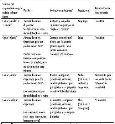 A partir de la reconstrucción de sus historias y los relatos de las entrevistas, logramos identificar cuatro categorías de sentidos referidas al trabajo independiente en las y los jóvenes de los dispositivos estudiados. En la tabla 2 aparecen esquematizadas y luego desarrollamos el contenido de cada una de manera más detenida, ejemplificándolas a partir de algunos casos.