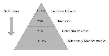 Por otro lado, la inequidad laboral se incrementa cuando aún en las mismas ramas de actividad se excluye a las mujeres de los cargos que cumplen funciones jerárquicas de dirección y se las relega a los puestos de menor calificación y de escasas posibilidades de progreso. En este sentido, siguiendo a Goren (2013), se les impone a las mujeres un umbral que determina escasas perspectivas de ascenso y desarrollo de la carrera profesional. Un techo de cristal que imposibilitaría el acceso de las mujeres a puestos de decisión y conducción y un piso pegajoso donde quedarían atrapadas las que ocupan cargos de baja movilidad en la parte inferior de la estructura ocupacional constituyen lo que en materia de economía se denomina segregación vertical por sexo en el mundo del trabajo.