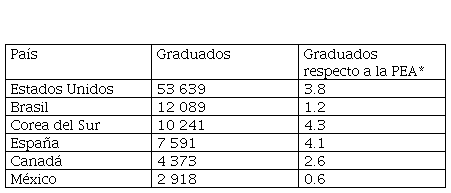 El alcance también se palpa por la eficiencia terminal. En el año 2019, en México se graduaron 2,918 doctores, en Estados Unidos fueron más de 53 mil y en Brasil 12 mil, lo que explica parte de las brechas de crecimiento y desarrollo socioeconómico entre países. La Tabla 4, muestra que esta diferenciación también se ve reflejada en la estructura productiva nacional, pues de cada 10 mil personas en edad laboral, solamente uno tiene este nivel de estudios en México, mientras que en Corea del Sur, España y Estados Unidos son cuatro.