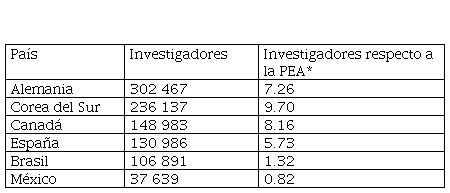 En el rubro de la investigación científica, por múltiples razones, el número de investigadores involucrados en dicha actividad sigue siendo bajo para México. Al confrontarlo con la Población Económicamente Activa (PEA), la Tabla 5 muestra que de los poco más de 37 mil investigadores contabilizados en el año 2020, forzadamente había un perfil de este tipo por cada 1000 personas en edad laboral, contrastando nuevamente la amplia heterogeneidad entre Corea del Sur y Canadá, lo que pone en desventaja no sólo la eficiencia productiva, sino la capacidad para hacer frente a los requerimientos de la sociedad y del país en general.