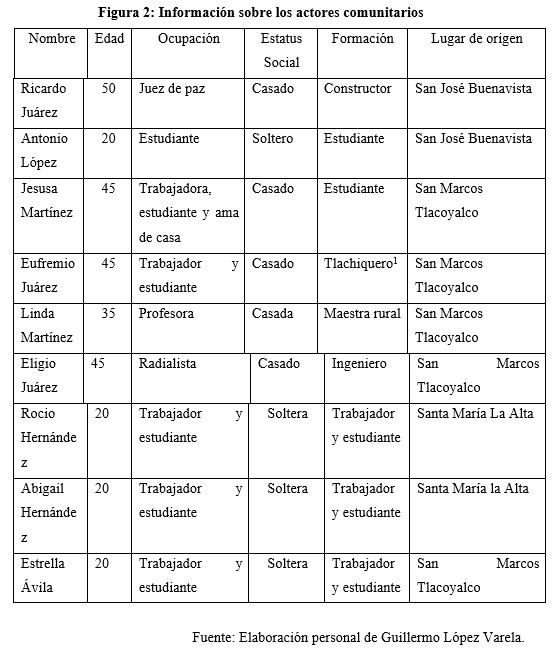 La información recabada durante los últimos doce meses se baso en entrevistas a profundidad y semi-estructuradas de forma remota por las razones del aislamiento por la pandemia de COVID19 en la plataforma Whatsapp, Meet y Zoom y los primeros meses en estancias con los actores comunitarios como profesor investigador de la Universidad Intercultural del estado de Puebla (México) en comunidades ngiguas, en particular, en San Marcos Tlacoyalco[ 7]. ( Ver Figura 2).