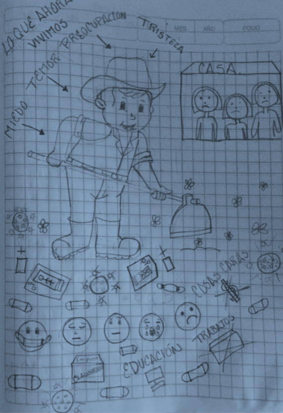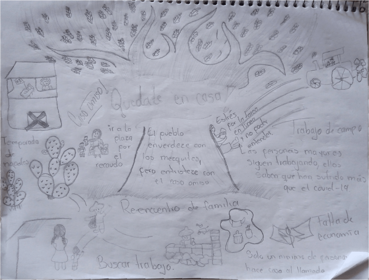 A la sombra de un árbol de mezquite, sagrado para la cultura ngigua, transcurren varias escenas en las que podemos atestiguar como la compañera Estrella Àvila de tercer semestre de la licenciatura en Lengua y Cultura, expresa su preocupación por los horizontes que atraviesan la experiencia pandémica en San Marcos Tlacoyalco. ?El pueblo enverdece con los mezquites, pero entristece con el caso omiso? son palabras que condensan la recuperación del lazo ecológico con la apropiación del territorio; ?trabajo de campo?, ?temporada de nopales? pero que lamentan el ?caso omiso? de las personas que siguen sin poder guardar algún distanciamiento social. Nos demuestra cómo por la deteriorada economía ?sólo un mínimo de personas hacen caso al llamado?, se debe ?buscar un trabajo? y las personas mayores de la comunidad siguen trabajando pues saben que se sufre más por hambre o pobreza que por una enfermedad que hasta entonces solo existe en las declaraciones de los políticos. Se demuestra como se dan ?reencuentros familiares? posibilitados por el cierre de circuitos económicos y los migrantes retornan a la comunidad que un día los vió partir. Se representa la búsqueda de trabajo en el sector de la construcción, la segunda actividad económica más importante después de la actividad agrícola, en contextos de recesión y depresión económica. Finalmente se muestran a cada lado del árbol de mezquite las dos actividades prioritarias de nuestros y nuestras estudiantes; la reproducción de la vida expresada en la necesidad de ?ir a la plaza por el recaudo? y la trama educativa caracterizada por el ?estrés por la tarea en línea y no poder entender?