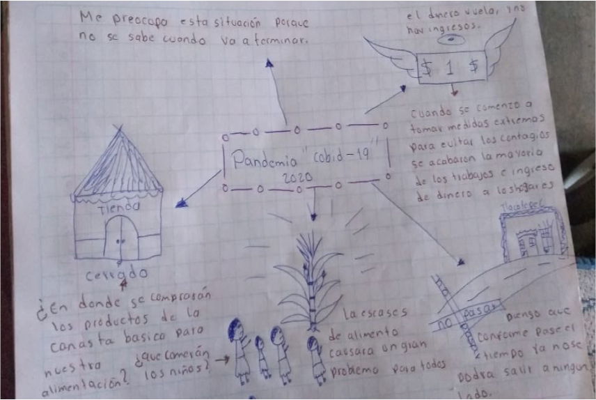 Teniendo como centro de la representación una planta del sagrado maíz domesticado por la cultura ngigua, la compañera Abigail Hernández del tercer semestre de la licenciatura en Lengua y Cultura de nuestra Universidad Intercultural, nos expresa sus preocupaciones ligadas al ámbito económico político, dibujando una comunidad totalmente cercada, afrentada y clausurada en su vida comercial donde ?el dinero vuela y no hay ingresos?, ?no se sabe cuando va a terminar? se acabaran la mayoría de los trabajos e ?ingresos de dinero a los hogares? y finalmente se pregunta ?¿Qué comerán los niños??