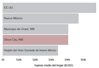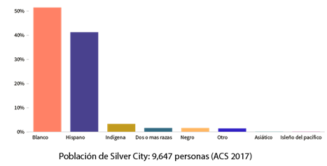 Silver City, NM; es un asentamiento urbano que se encuentra en la intersección de importantes características geográficas. Como se señaló anteriormente, sirve como el área metropolitana del sudoeste de Nuevo México, que se extiende desde Deming al oeste. Incluye porciones significativas de los municipios Catron, Grant, Hidalgo y Luna que se caracterizan por las altas tasas de pobreza individual o doméstica y el desafío de una nutrición y alimentación correcta que se alejan del promedio de las normas establecidas para el Estado de Nuevo México, así como para los Estados Unidos en su conjunto ( Feeding America, 2019; United States Census, 2018). La figura 2 muestra los ingresos promedio de la zona estudiada y la figura 3 la conformación racial.