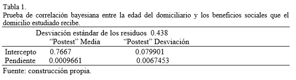 Existe solamente una relación pequeña entre la edad del domiciliario y los beneficios sociales que el domicilio estudiado recibe. Realizándose una prueba de Chi es posible ver la poca relación entre el desempeño de edad y el beneficio: X-al cuadrado 16.957, df 21, p-valor 0.7137. Con el método de Bayesiano, sin embargo, se obtuvo un resultado menos similar, pero con las mismas consecuencias ( Tabla 1).