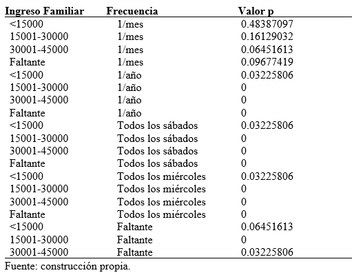 Notablemente, el ingreso familiar se correlaciona con el uso de despensas de alimentos en los hogares que están por debajo de $15.000 dlls. anuales. Donde se adquiere una despensa al menos una vez al mes; esto representa un 48.39%, casi la mitad de la muestra en comparación con el segundo, donde el ingreso es de $15.001-$30.000 dlls. anual y está representado por un 16.13%, en donde los hogares adquieren una despensa por mes ( Tabla 2).