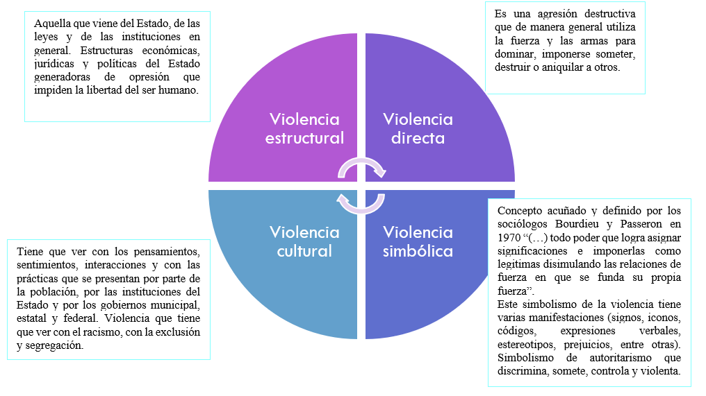 De acuerdo con estas dimensiones, Sandoval-Forero analiza estas violencias como un espiral, como una relación interconectada entre ellas, ya que la manifestación de una se hace presente en las otras, y produce una crisis de paz, de tolerancia, de convivencia, de la hospitalidad internacional, del reconocimiento y respeto a la diversidad étnica y cultural en el estado de México.