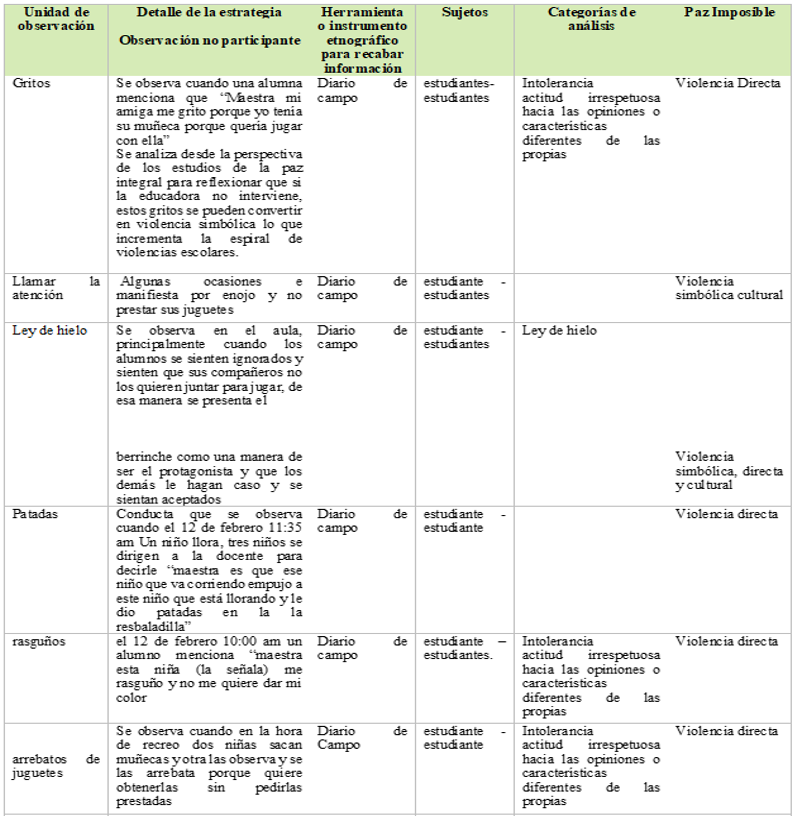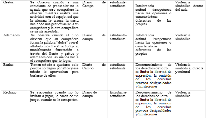 La tabla describe los hallazgos en campo, y deja al descubierto diversas manifestaciones de violencias al interior del aula, que de acuerdo con Salazar (2013), estos diferentes tipos de violencia, comprendidos como fundamentales en los estudios para la paz, desde la perspectiva escolar.