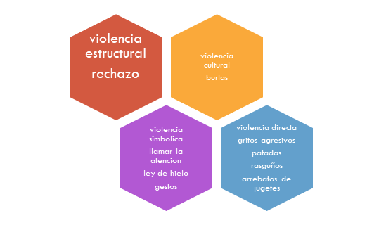 ·Violencia estructural: Se inscribe en el marco social y su principal característica es la desigualdad. Se trata de una injusticia social que influye en niños, niñas y adolescentes, haciéndose presente de manera directa o indirecta en las escuelas. Se refiere al conjunto de estructuras físicas y organizativas que no permiten la satisfacción humana.