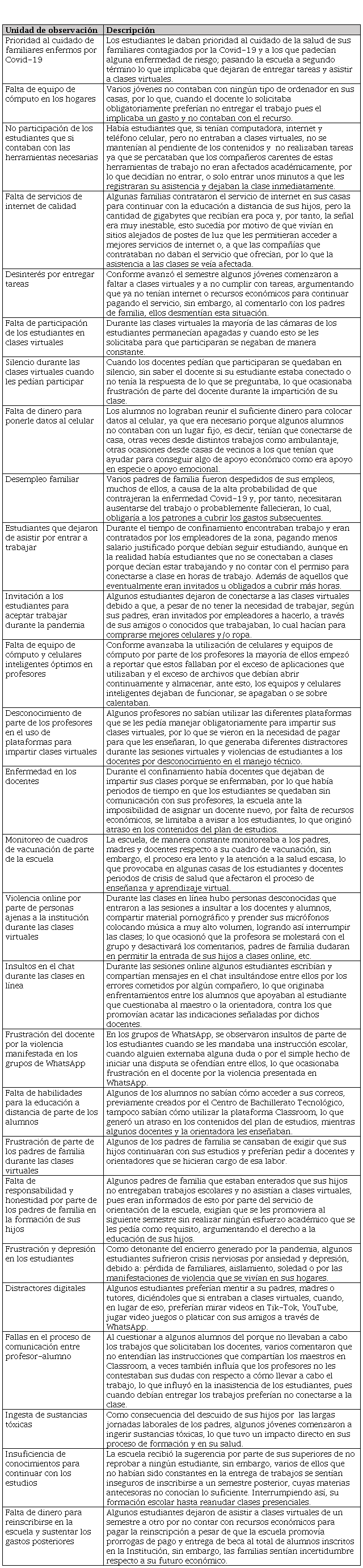 A partir de la información recabada en campo se realizó la matriz de unidades de observación que deja al descubierto la realidad de los estudiantes de bachillerato en torno a su asistencia e inasistencia en las clases virtuales. Dentro de la matriz de unidades de observación en la Tabla 2. se enlista y se describe lo que se observó y registró en el campo de observación.