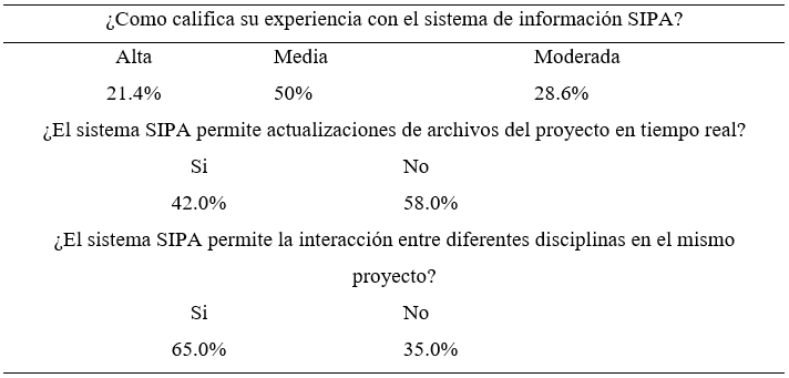 Las respuestas que se obtuvieron en relación con las posibilidades que ofrece SIPA para el trabajo colaborativo en tiempo real, representan un error para los resultados de la encuesta, debido a que en las preguntas 21 y 22, hizo falta desarrollo. El sistema SIPA sólo permite cargar archivos al servicio de almacenamiento (Ministerio de Cultura, 2018), la interfaz no cuenta con funciones para trabajar directamente con los archivos ya subidos al sistema, únicamente permite reemplazarlos antes de que se radiquen formalmente en el sistema. Sin embargo, aproximadamente la mitad de los encuestados respondió que SIPA les permite trabajar en tiempo real y que permite la interacción colaborativa entre las especialidades del equipo de trabajo.