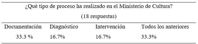 La mayoría (67%) de los encuestados buscaba lograr autorización para llevar a cabo actividades de diagnóstico y/o de intervención, mientras que el 33% restante tenía el objetivo único de consultar los documentos de proyectos previos archivados en el Ministerio de Cultura. Es importante resaltar que, en este escenario, la metodología BIM sería útil al 100% de los encuestados, ya que con esta se logran modelos de información que sirven durante la ejecución del proyecto, así como para el almacenamiento, la publicación y la reutilización de la información.