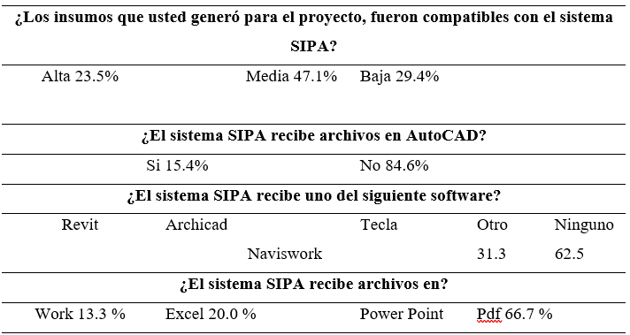 Casi la mitad de los encuestados reportó compatibilidad media entre los entregables que habían producido y el SIPA. Lo cual responde a que la mayoría (85%) no le fue permitido entregar información en formato DWG (AutoCAD), y al 62,5% no le fue permitido entregar productos en DWG (ArchiCAD), RVT (Revit), ni NWF (Navisworks). La mayoría (66,7%) sin embargo, entrego productos en formato PDF, y el 20% en XLSX (Excel).