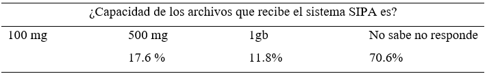La gran mayoría, el 70% de los encuestados, dice no saber la capacidad de almacenamiento del sistema SIPA, que, en general es amigable con el usuario, pero no cuenta con web-bot.