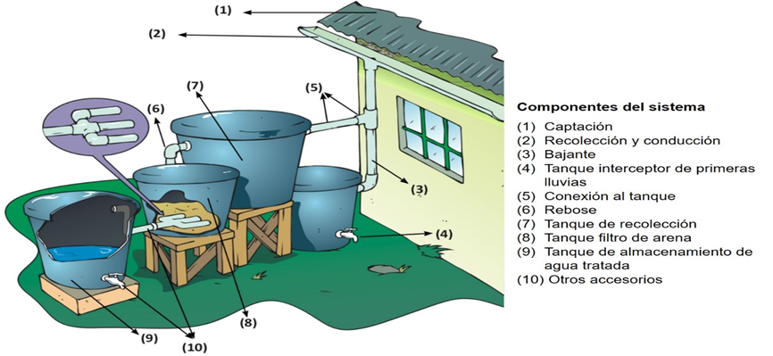 En el municipio de Rayón, con referencia al servicio de agua entubada o potable, se reconoce como uno de los servicios deficientes, derivado de la falta de agua potable que existe en el municipio, y el poco o casi nulo suministro con el que cuenta el Centro de Bachillerato Tecnológico de este tan preciado líquido, se optó por buscar estrategias para poder abastecer a la institución de agua, ya que sin este vital liquido no es posible el funcionamiento de la misma. Por lo que se recurrió a planear un sistema de captación de agua de lluvia, que conjunta técnicas y dispositivos diseñados para recolectar y almacenar el agua que cae en temporada de lluvia, con el objetivo de aprovechar esta agua como una alternativa al servicio municipal logrando mejorar la autonomía de nuestro centro escolar. El aprovechamiento del agua de lluvia se ha convertido en un incentivo para la gestión y el uso eficiente del agua. De esta forma, está siendo utilizada principalmente para el uso de los sanitarios de la institución. Por tal motivo se optó por instalar un sistema de captación de lluvia, que pueda abastecer a toda la comunidad escolar y dejar de depender de un suministro que no nos garantiza satisfacer las necesidades de la comunidad escolar del CBT Ignacio López Rayón. En la Figura 1 se puede observar de qué elementos se compone un sistema de captación de lluvia.