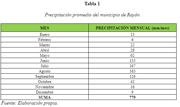 En la siguiente tabla podemos observar el análisis de la precipitación promedio, en el municipio de Rayón, considerando la información de la estación hidro-climatológica se obtuvo el dato de 779 mm/año/m², distribuidos predominantemente en los meses de verano.
