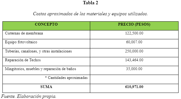 Otro aspecto fundamental es el costo de este tipo de proyectos, que es importante considerarlo para organizaciones comunitarias. En el caso de nuestro proyecto comentamos los gastos realizados, el costo de instalación de sistema de captación de agua pluvial puede variar dependiendo de diversos factores, como el tamaño del área de captación, el tipo del sistema de almacenamiento y las características del terreno. En la siguiente tabla se muestra el costo aproximado de cada uno de los materiales y/o equipos que se utilizaron en este proyecto, así como también el costo total del mismo.