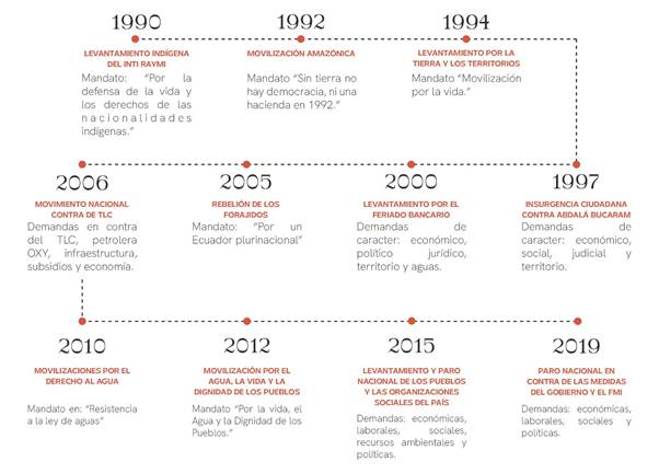 En el Ecuador, los ciclos conflictivos han marcado su historia hasta los días actuales, teniendo al movimiento indígena como protagonista de importantes movilizaciones durante los llamados levantamientos; en defensa de la tierra, de la naturaleza, de su identidad étnico-cultural y, progresivamente, de un espacio representativo en el escenario político con posibilidades de actuar como interlocutor del Estado. En la memoria colectiva del país, los años noventa significaron un cambio de paradigma en la lucha social y reivindicativa por los derechos del pueblo ecuatoriano, siendo el momento en que la estructura organizativa del movimiento indígena se constituyó como un referente latinoamericano de los movimientos, organizaciones y colectivos sociales (CONAIE, 2020), con particular énfasis al levantamiento del Inti Raymi, organizado por la Confederación de Nacionalidades Indígenas del Ecuador (CONAIE).