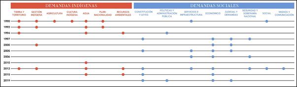 A partir de entonces, esos procesos se intensificaron, marcando un período de continuos levantamientos que, para efectos didácticos, serán aquí resumidos en cuatro ciclos: el primero, comprende las movilizaciones de 1990, 1992, 1994 donde se perciben reivindicaciones más cercanas a las pautas históricas de los pueblos indígenas y, sobre todo, una afirmación del movimiento indígena como tal en el escenario nacional; el segundo, relacionado a las movilizaciones de 1997, 2000, 2005 y 2006, donde el movimiento indígena se suma como un actor relevante a las pautas relativas a la política nacional; el tercero que abarca los levantamientos de 2010, 2012, 2015; y el cuarto que desborda en el Estallido de 2019.