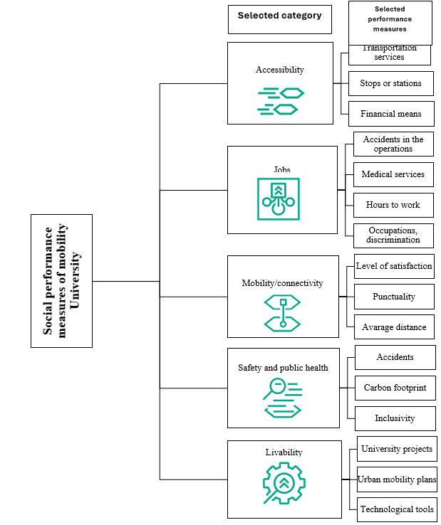 The jobs categories refer to accidents in transfer, medical services, hours to work and occupations or positions within employees of the University that are involved in or affected by mobility systems, this category typically includes administrative staff, whose work or daily activities may require mobility within or around the University campus. The mobility or connectivity refers to the level of satisfaction, punctuality and average distance of access within the University campus and its surrounding areas. The safety and public health category assesses the well-being, inclusivity, and security of individuals (accidents) using transportation systems on and around university campuses, supporting the creation of a healthy environment. This includes aspects like the carbon footprint, aiding in the shift toward low-carbon modes or, at the very least, a lower-carbon economy (Duan et al., 2015; Ghate & Qamar, 2020) achieving national mitigation targets (SEMARNAT & INECC, 2022). And finally, the livability on transportation system, enhance the quality of life for contribute to include considerations such as accessibility to amenities and services, availability of diverse transportation options, designing transportation infrastructure and policies that prioritize the needs and preferences of the University community, and inclusive campus environment, promoting sustainable mobility practices.