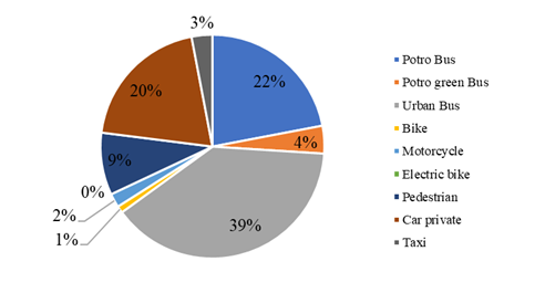 Likewise, according to the mobility service, private cars are the most used mode of transportation by academics, with a travel time ranging from 16 to 30 minutes. In the case of administrative staff, the majority chose 45 minutes or more using public transportation (bus), although most of them traveled distances of 21 to 40 km. Students have also opted for the option of 45 minutes or more, and in this case, the service with the highest votes is public transportation (bus), followed by the Potro Bus. These results are similar of Obregon Biosca, (2020), who reported that on Autonomous University of Queretaro, Mexico, 73 % of trips are mainly made by Urban bus of extension length 21 km. The average distance traveled is over 60 km, indicating a relationship between the time and distance covered. The cost of daily travel represents 39 % of students, with urban transportation (bus) being the most chosen means of transportation, spending between 0 and 1.50 USD, followed by 1.26 to 3 USD by academics and administrative staff; also considering it`s the most economical, and being low according to what the students reported spent more than 2.47 USD per day (Obregon Biosca, 2020).