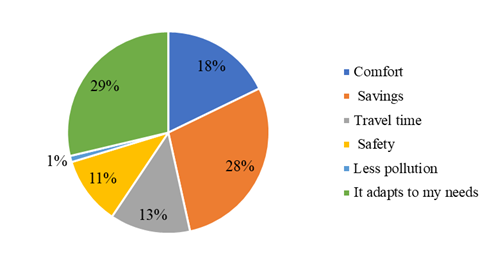 The level of satisfaction that they have when choosing a mobility service is mainly 29 % adapt to their needs and 28 % savings, without leaving behind 18 % comfort, 13 % travel time, and 11 % safety, considering that their satisfaction level is good, as shown in Figure. 4, being a principle that if carried out in the Road Safety and Mobility University program (UAEMEX, 2024).