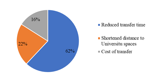 The Interurban Train started partial operations in September 2023, at the four stations of the section that corresponds to the State of Mexico. The service schedule is from 06:00 to 23:00 hours and the tour is completed in approximately 16 minutes. Of the 17 % of students who answered that bring them some benefit. The Figure. 6, responded with 62 % of students that it is the reduction of transfer time the greatest advantage, which the advantage of distance and cost.