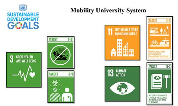 Incorporating SDG could enhance its widespread applicability, as it provides a standard for interpreting individual performance, thereby increasing its appeal (Hannouf et al., 2023; Pollok et al., 2021) . The Mobility University System, figure 8, have connections with SDG 3 (Health and well-being), target 3.2, aims to halve the number of road traffic deaths and injuries worldwide, target 3.9, the number of deaths and diseases caused by hazardous chemicals and air, water and soil pollution must be reduced. On the other hand, SDG 11 (Sustainable cities and communities) target 11.2 mentions that safe, affordable, accessible and sustainable transport service should be provided in addition to improving road safety by expanding public transport, for all, but paying special attention to the vulnerable groups. About SDG 13 (climate action), target 13.2, focus on integrating climate change measures adopting policies that favor low-carbon growth, and contribute to global efforts to reduce GHG emissions, helping to slow down global warming. The results of this SDG in 2019 show that only half of the world’s urban population had convenient access to public transport. The alignment with these goals is to promote low-carbon urban transport and achieve carbon neutrality at the University, provides a standardized method using historical data to analyze global urban transport CO2 emissions and identify transition phases towards low-carbon transport (Li et al., 2022), and find significant policy implications for urban sustainability and transportation planning.