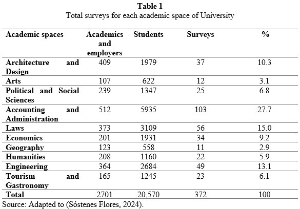 To obtain the stratified sample size, the data reported in the Statistical Agenda was used (UAEMEX, 2023a), as shown in (1), resulting in 372 individuals divided into ten academic spaces (Table 1), reported by Rodríguez G., (2017).